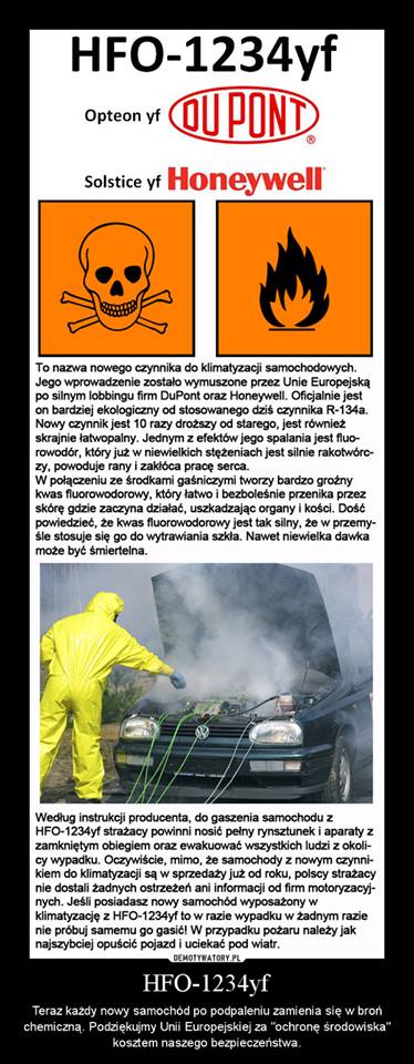 Nowy środek chłodniczy R-1234yf, którego stosowanie na producentach aut wymusza Komisja Europejska, jest skrajnie łatwopalny. Gdy zaczyna się palić, powstający gaz – fluorowodór – rozpuszcza szkło, przenika przez skórę, reaguje z tkankami. Osobom narażonym na kontakt z nim nie daje szans na przeżycie. Producent środka ostrzega strażaków, by w przypadku pożaru takiego auta stosowali pełny ubiór ochronny i izolowany aparat tlenowy. Problem w tym, że strażacy nie wiedzą, w jakich autach jest ten czynnik, ani że jest.